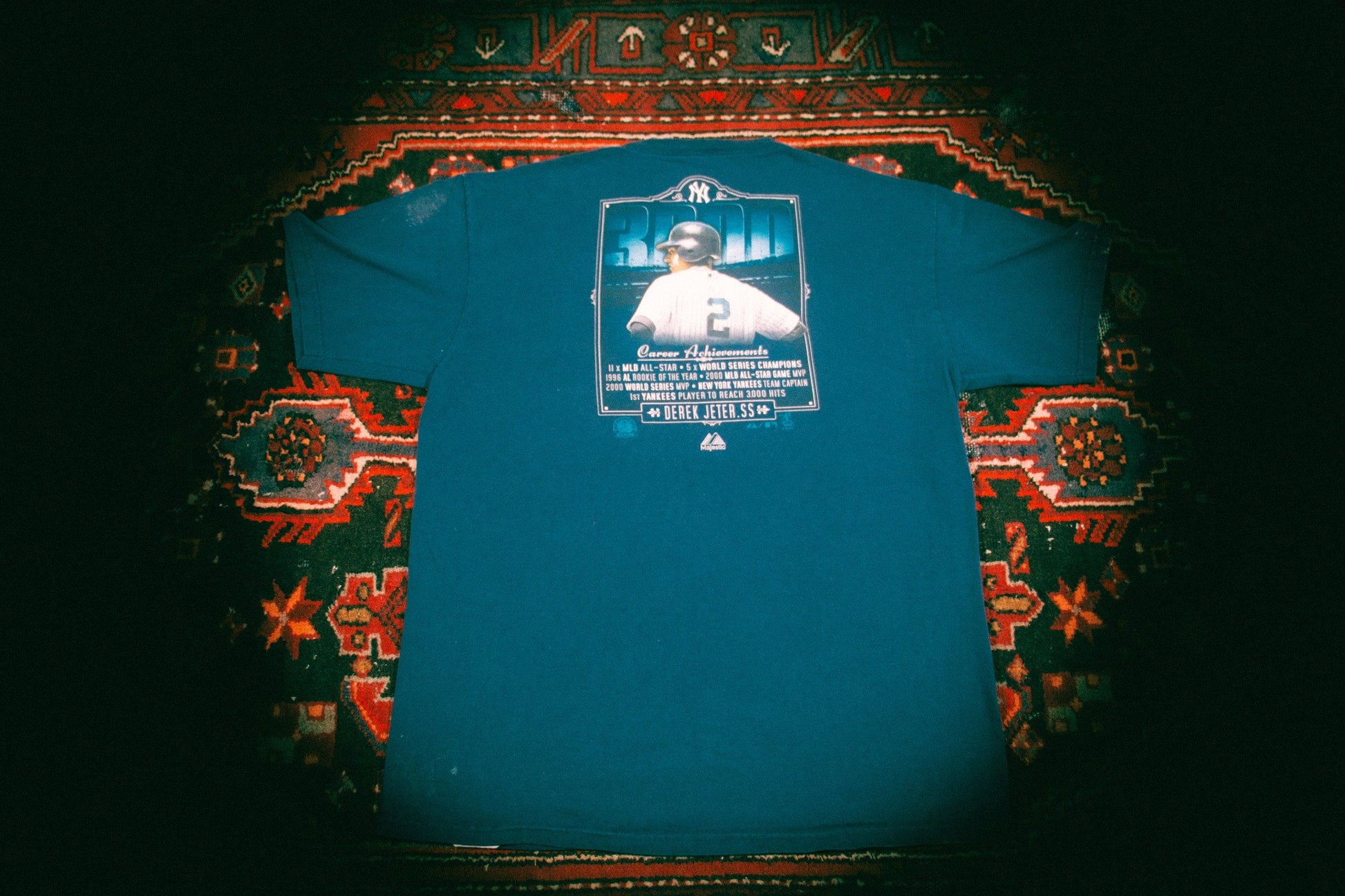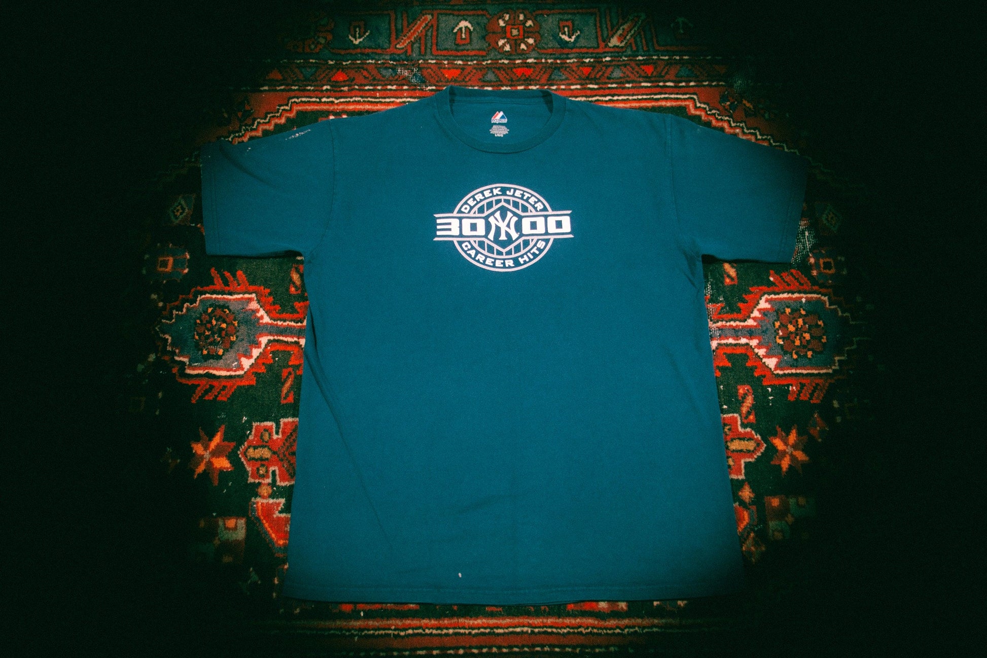 Milestone moment. This vintage Yankees tee celebrates Derek Jeter becoming the first Yankee to reach 3,000 hits. Front features a bold “3000” emblem, while the back lists career highlights and a full graphic of the Captain in pinstripes.