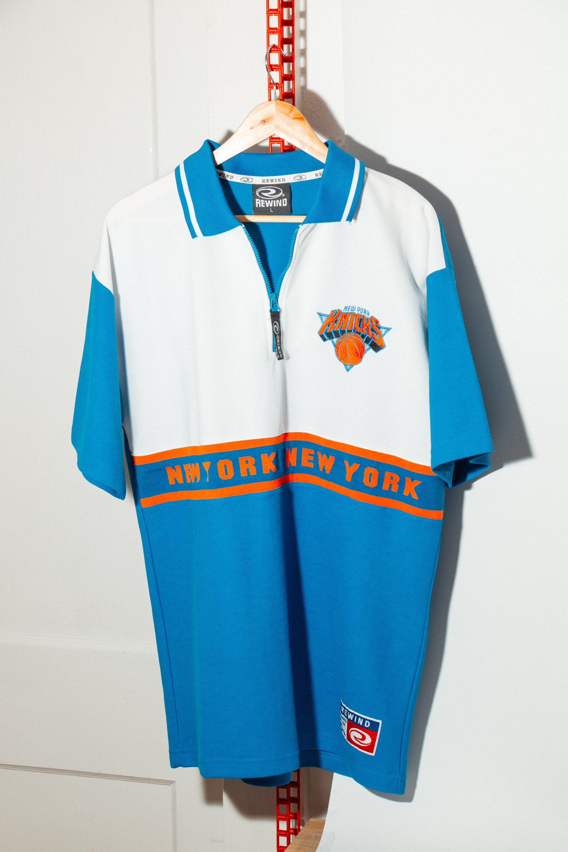 A rare Knicks warm-up style from Rewind’s late-90s/early-2000s era, built in a breathable athletic poly with that unmistakable retro color blocking. White upper, bright Knicks blue lower, and a bold NEW YORK NEW YORK band wrapping the torso in classic orange. The embroidered chest logo hits with that sharp, old-school stitching, and the stand collar + quarter zip gives it a true warm-up feel.